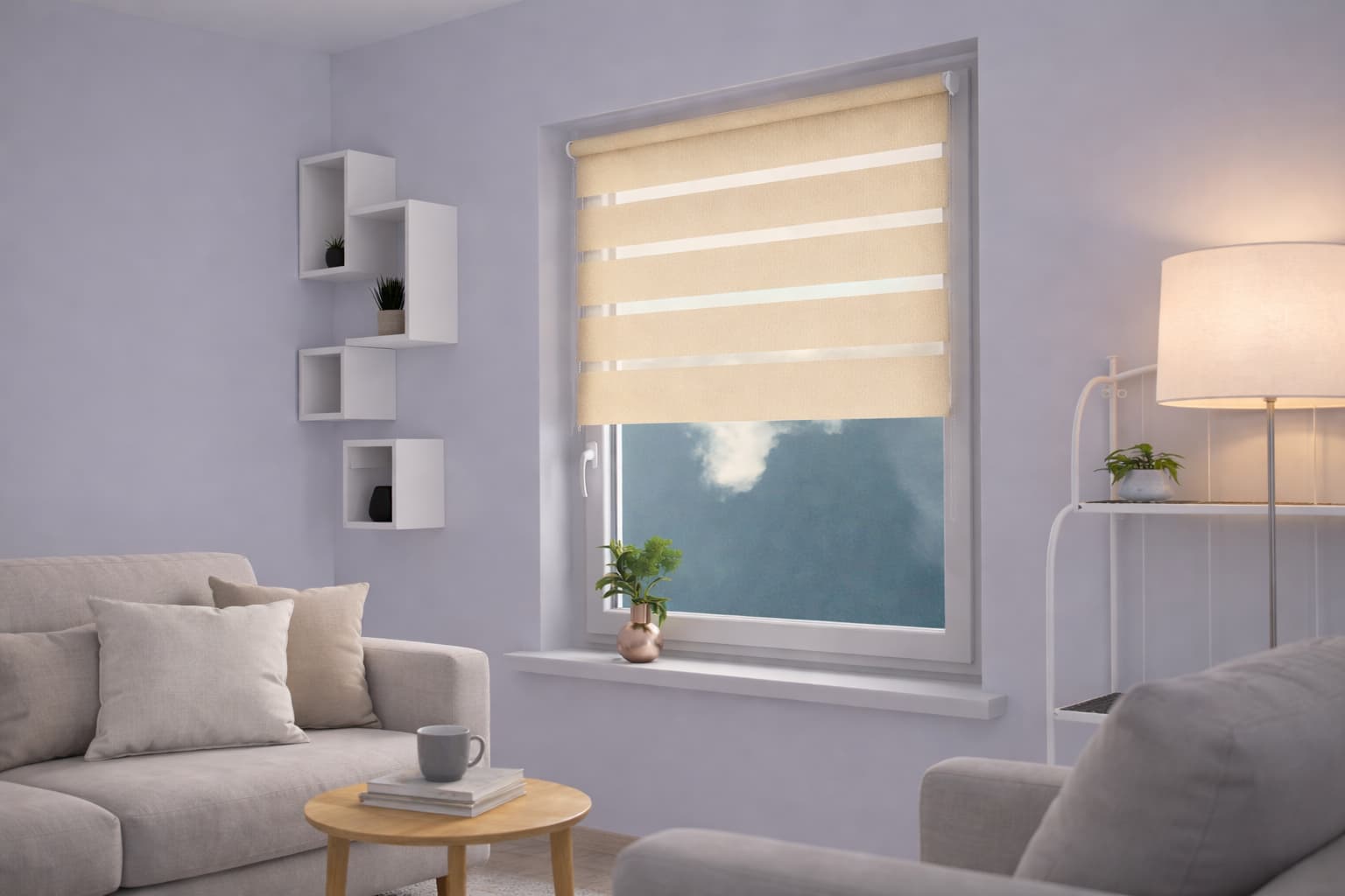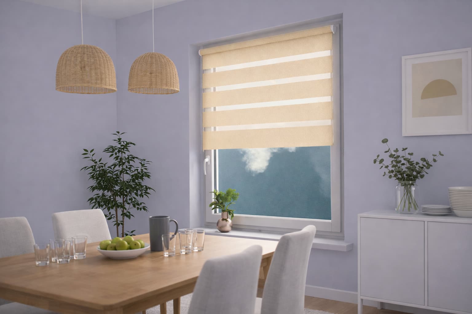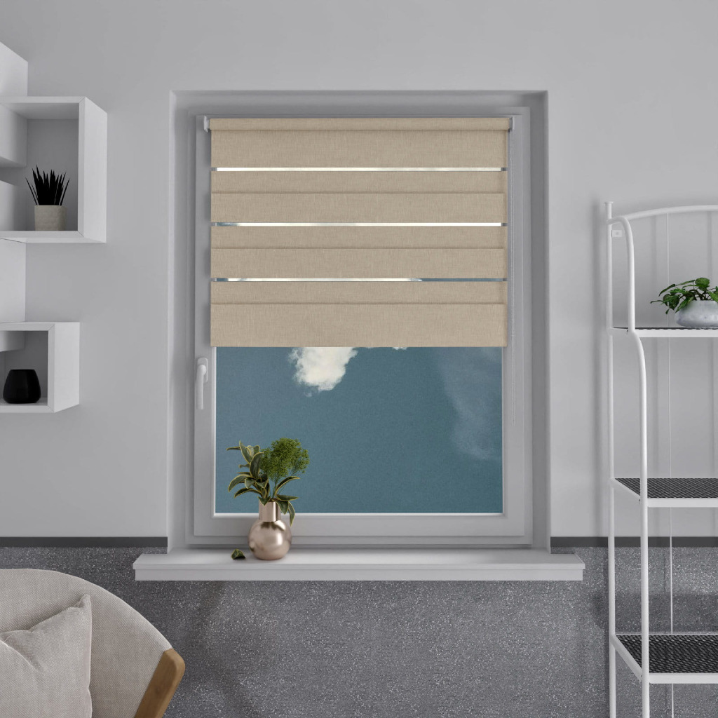 Zastosowanie tkaniny o naprzemiennych pasach transparentnych i odcieniu ecru to nowoczesne rozwiązanie, umożliwiające precyzyjną regulację zaciemnienia. Prowadzenie żyłkowe utrzymuje materiał w stałym położeniu, co podnosi estetykę i funkcjonalność.