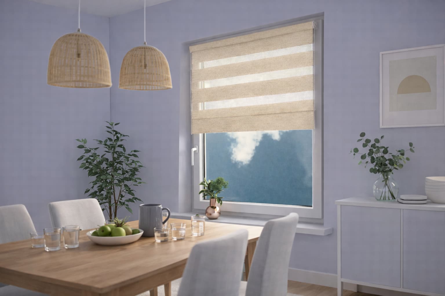 Zastosowanie tkaniny o naprzemiennych pasach transparentnych i kremowych to nowoczesne rozwiązanie, umożliwiające precyzyjną regulację zaciemnienia w zależności od potrzeb. Prowadzenie żyłkowe utrzymuje materiał w stałym położeniu, co zapewnia estetykę i funkcjonalność.