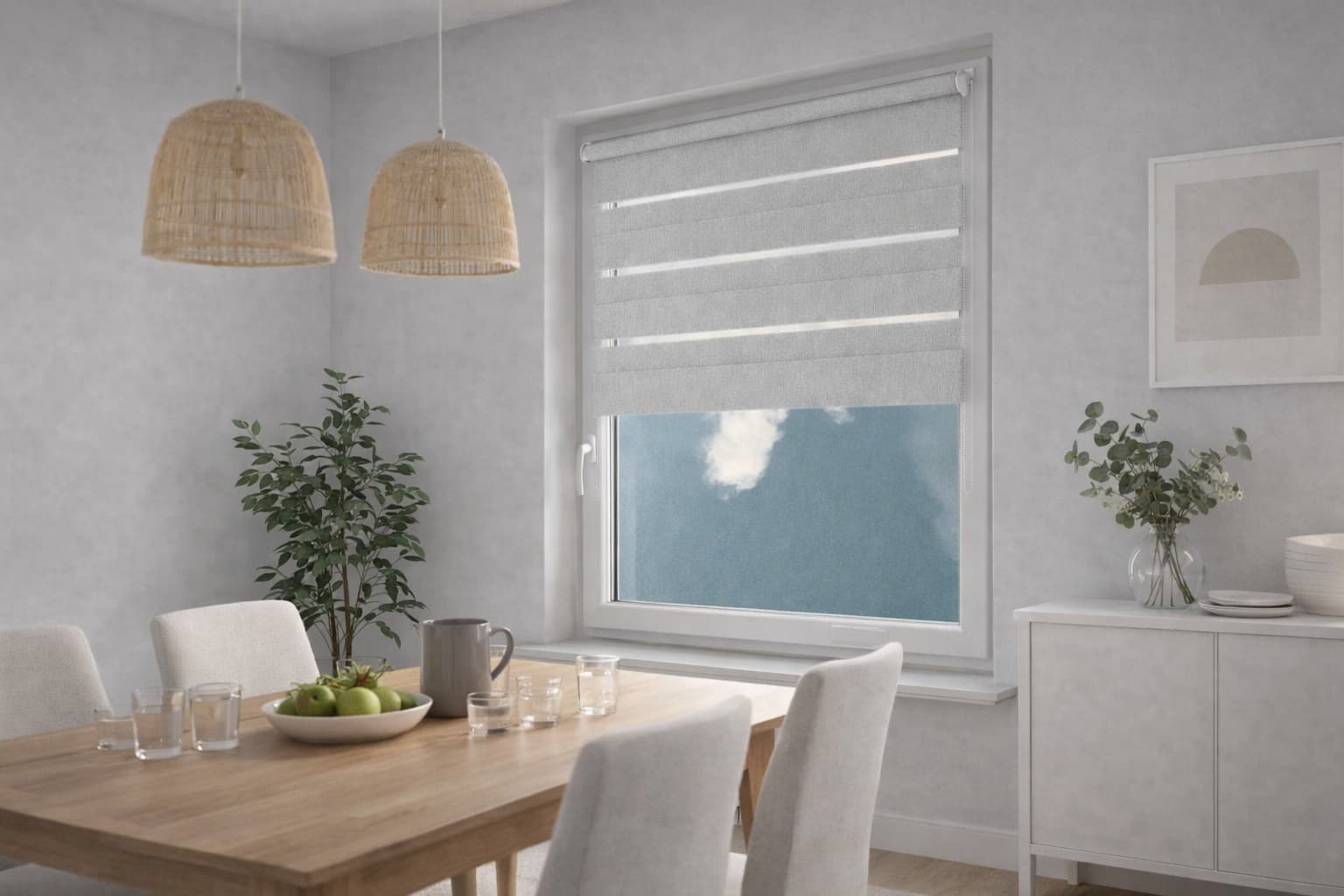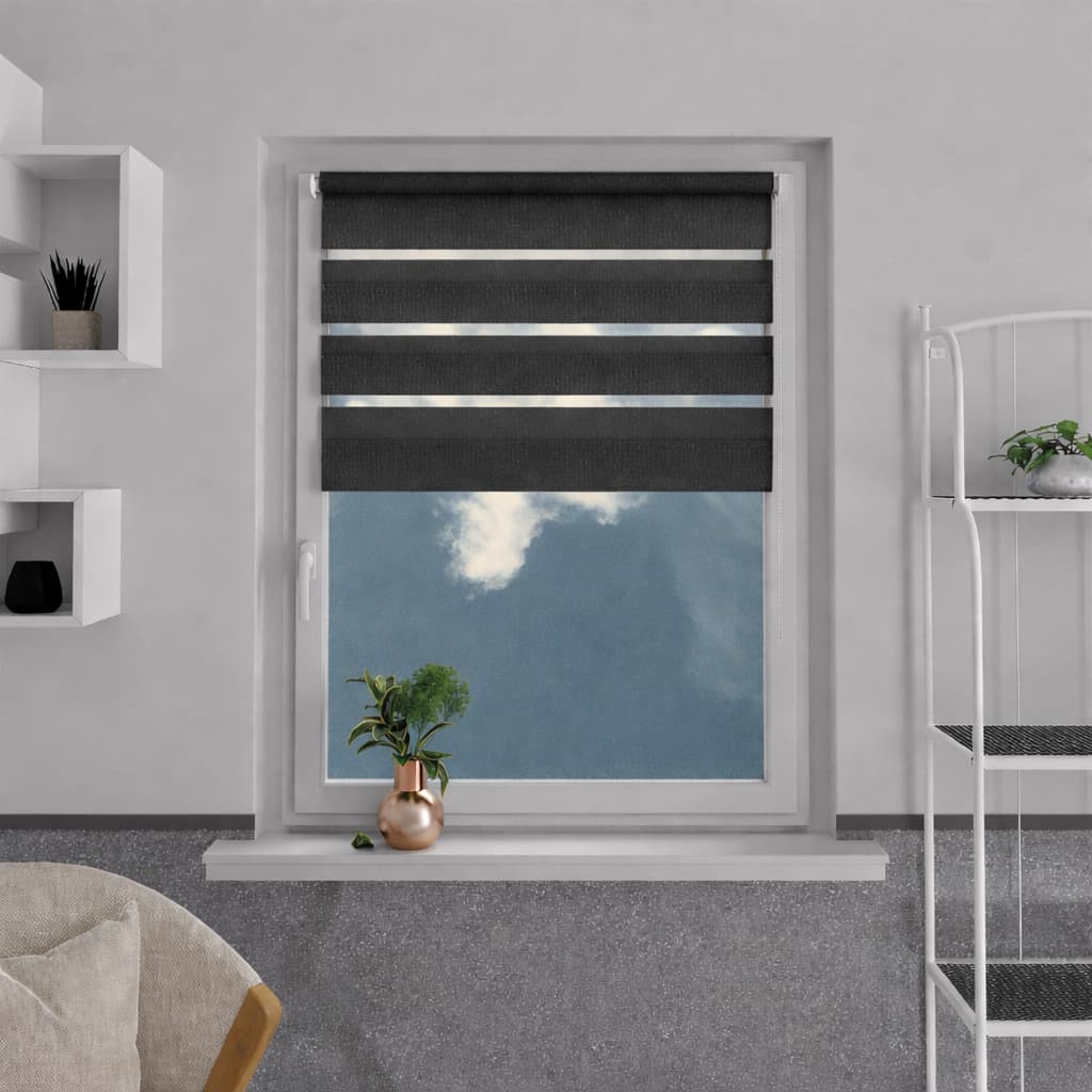 Zastosowanie tkaniny o naprzemiennych pasach transparentnych oraz jasnoszarych to nowoczesne rozwiązanie, umożliwiające precyzyjną regulację zaciemnienia w zależności od potrzeb. Prowadzenie żyłkowe utrzymuje materiał w stałym położeniu, zapewniając dodatkową estetykę i funkcjonalność.