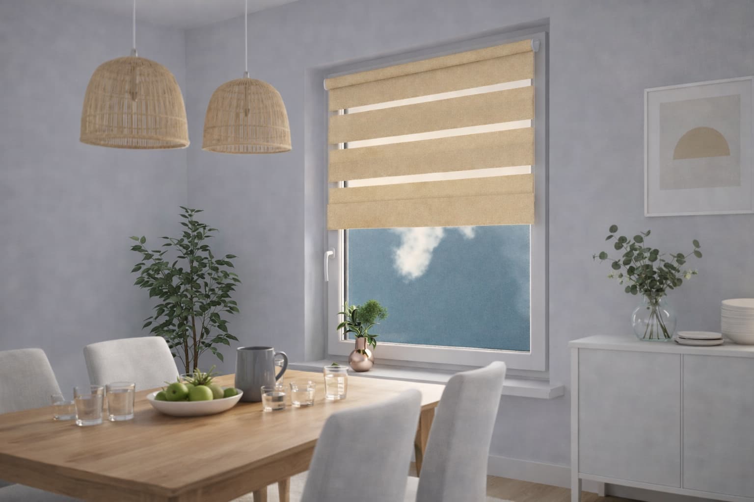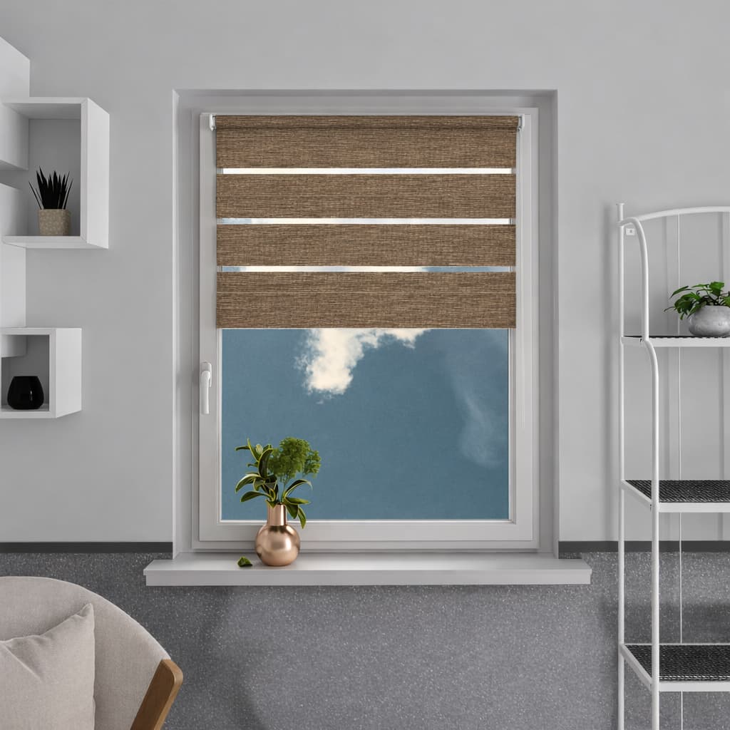 ✅ Tkanina o naprzemiennych pasach – transparentne i zaciemniające pasy umożliwiają regulację światła od lekkiego przyciemnienia po pełne zaciemnienie.