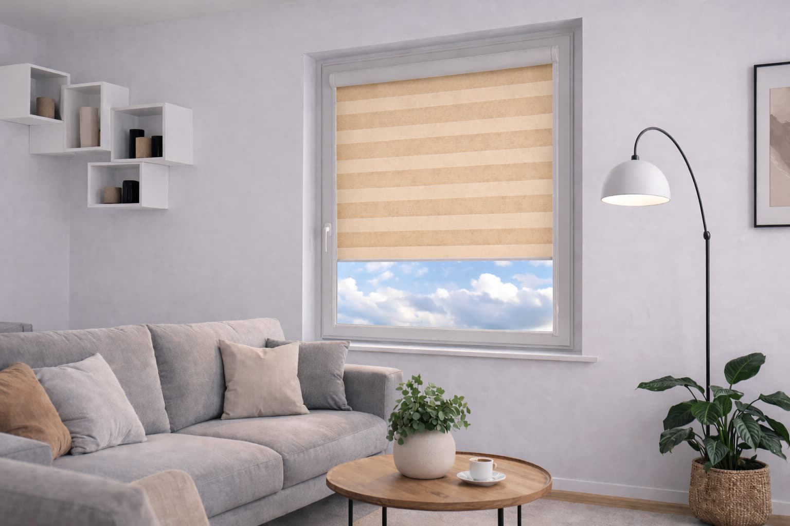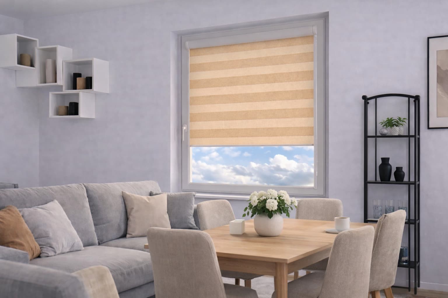Naprzemienne pasy transparentne i zaciemniające w beżowym odcieniu umożliwiają precyzyjną regulację światła. Ustawione w pozycji „noc” skutecznie zaciemniają wnętrze, zachowując subtelny przepływ światła.