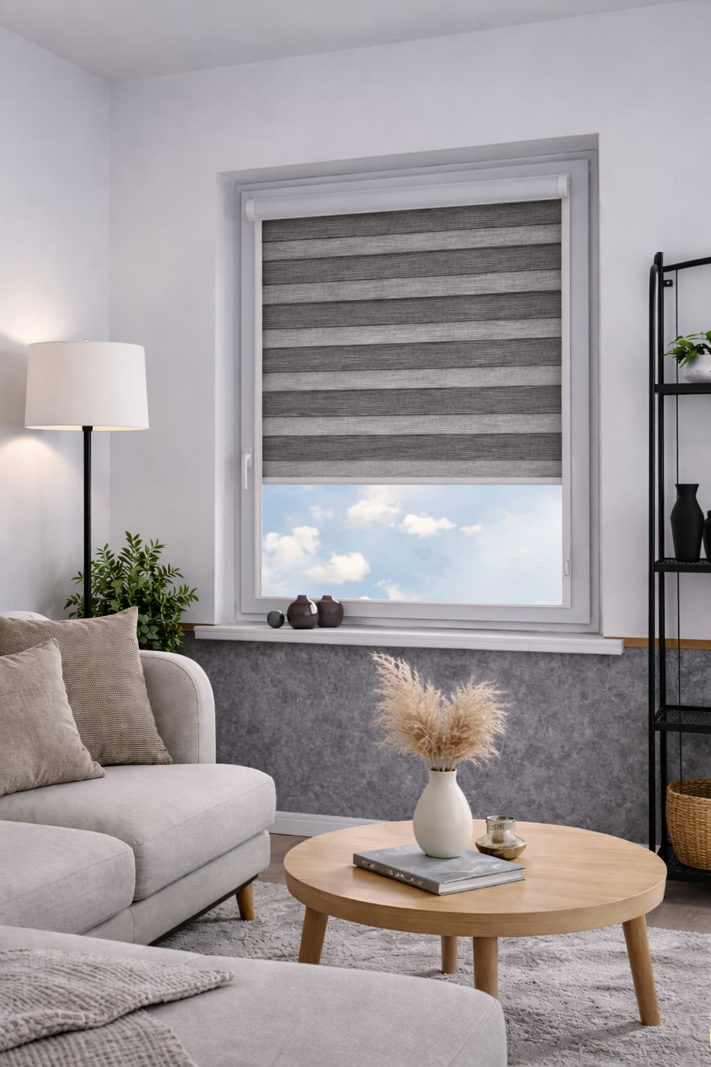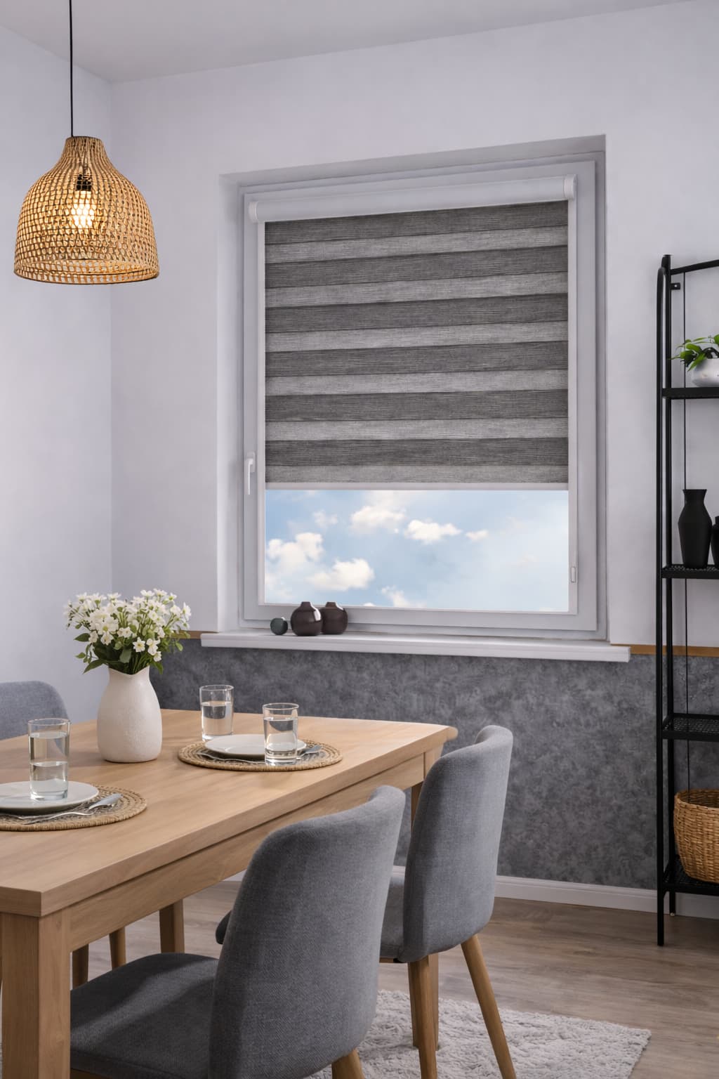 Naprzemienne pasy transparentne i zaciemniające w odcieniach beżu i szarości umożliwiają precyzyjną regulację ilości światła wpadającego do wnętrza. Beżowo-szara kolorystyka nadaje roletom subtelności i wyrafinowania, doskonale komponując się zarówno z klasycznymi, jak i nowoczesnymi aranżacjami.
