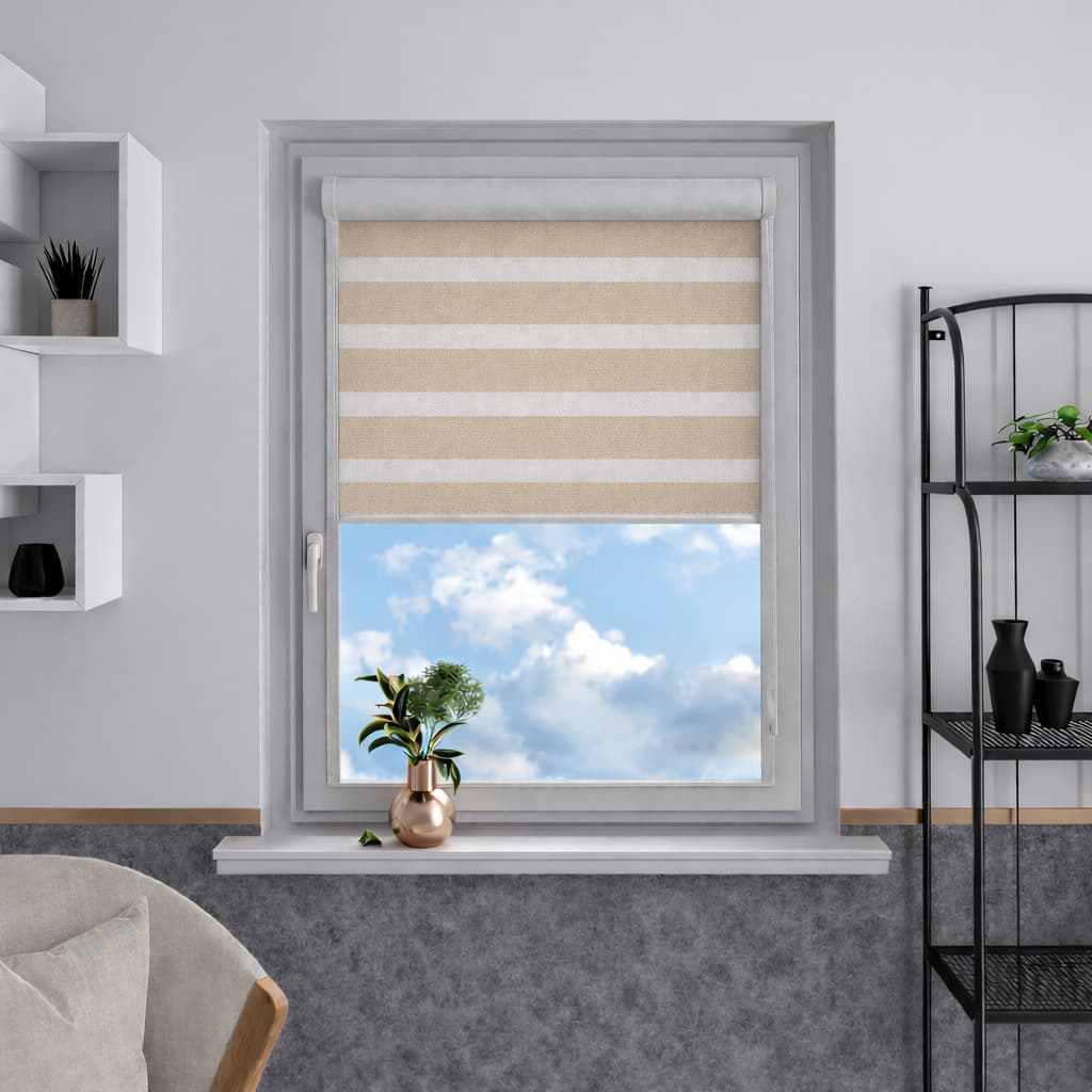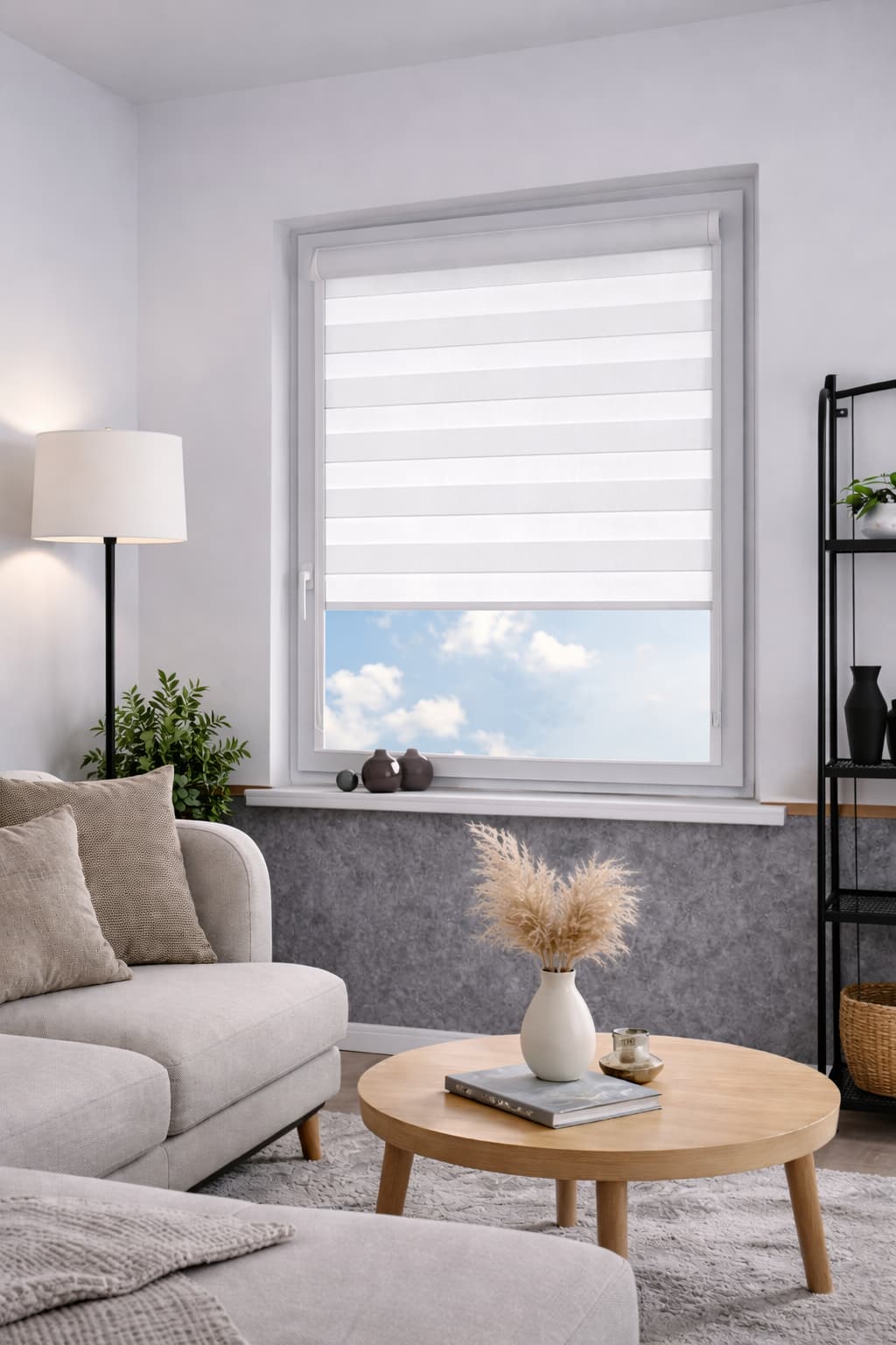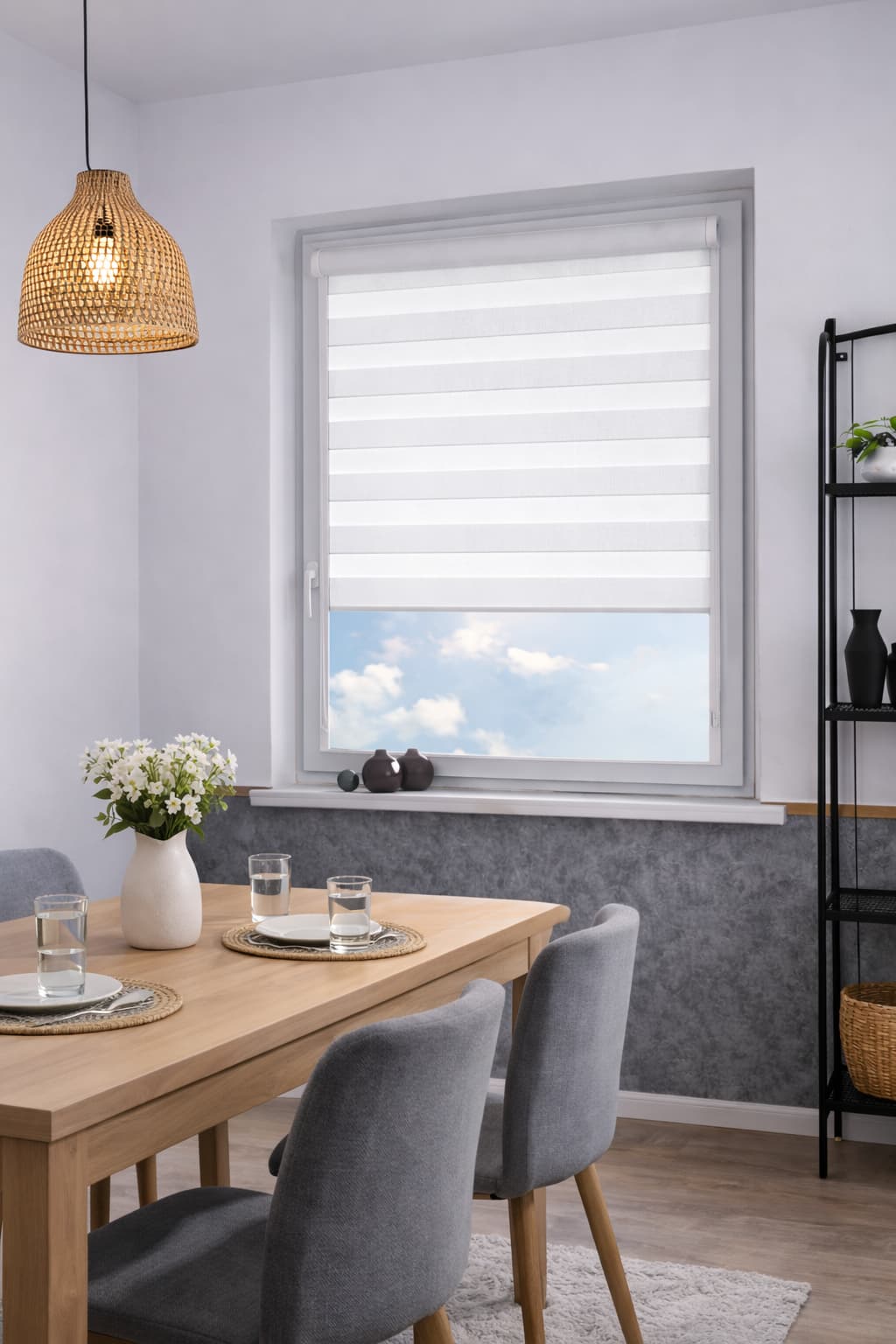 Naprzemienne białe pasy transparentne i zaciemniające umożliwiają swobodną regulację światła, jednocześnie podkreślając subtelny i nowoczesny wygląd wnętrza. Biała tkanina dodaje lekkości i świeżości, pasując do każdego stylu aranżacji.