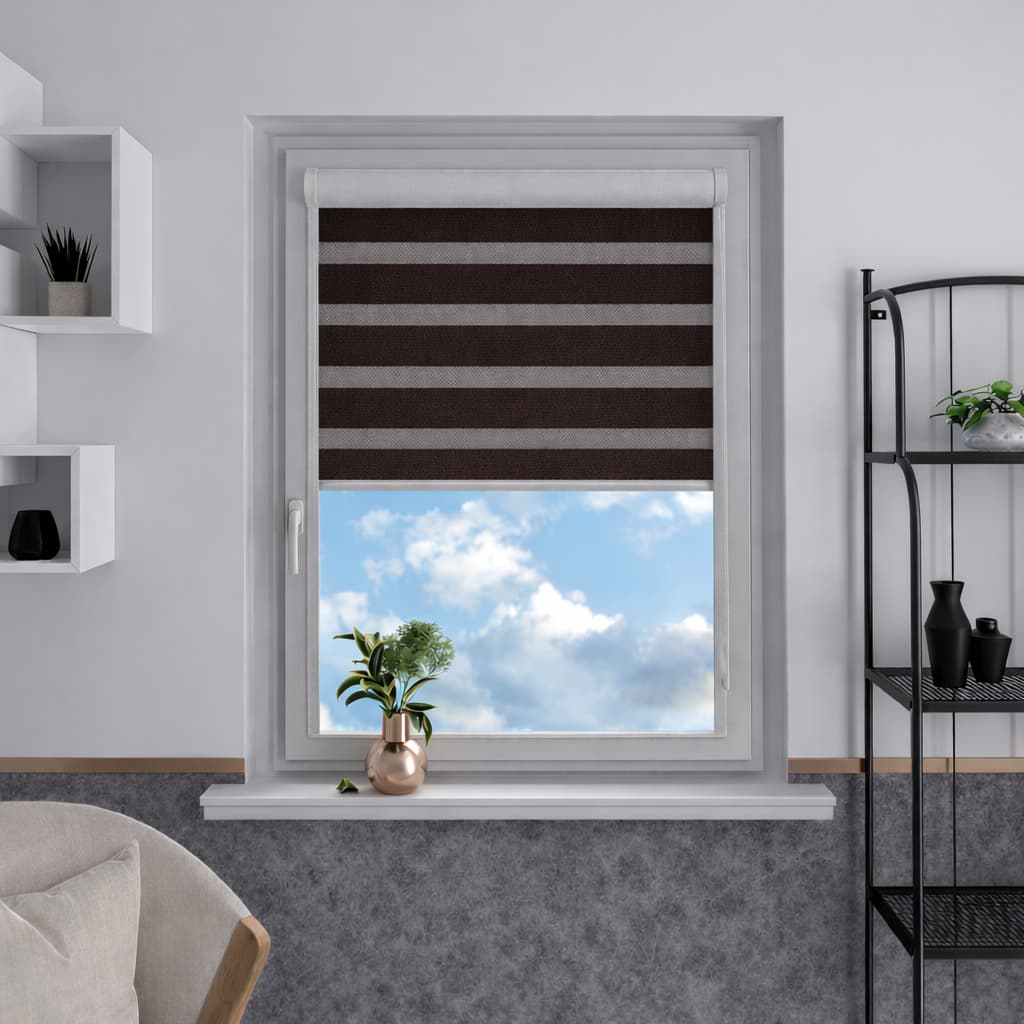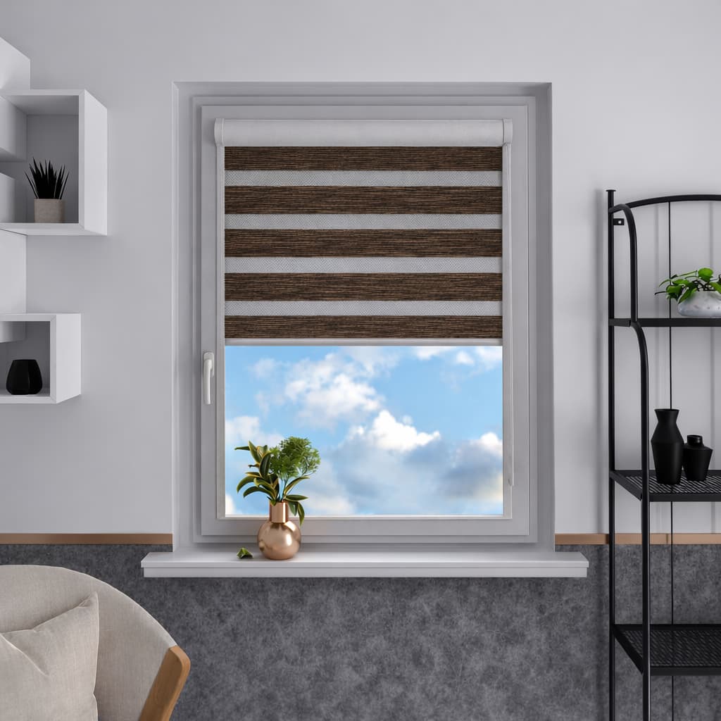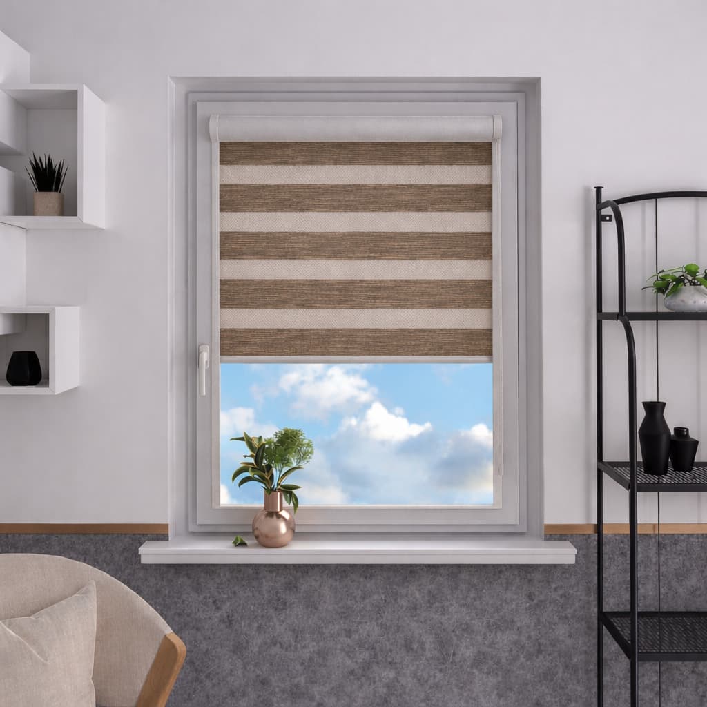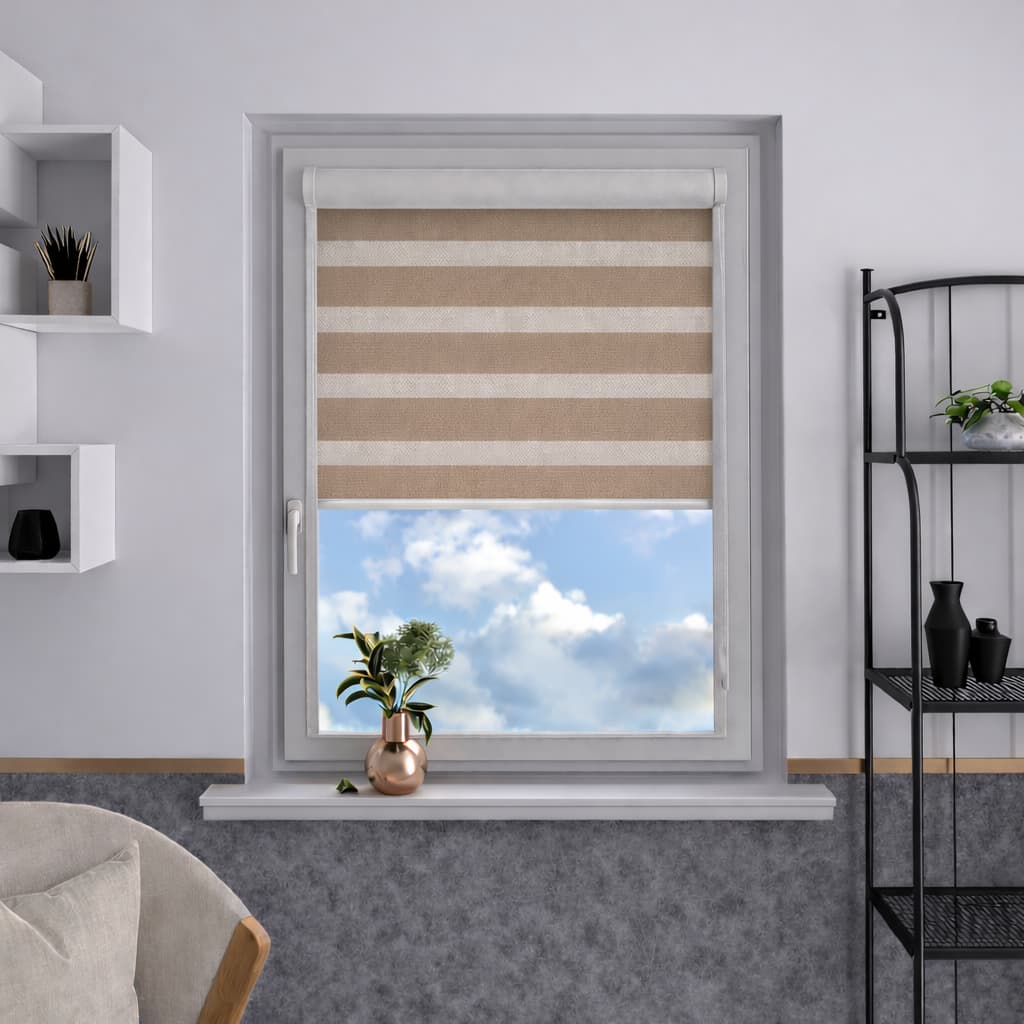 Naprzemienne jasno szare pasy transparentne i zaciemniające umożliwiają swobodną regulację światła, podkreślając elegancki i nowoczesny charakter wnętrza. Jasnoszara tkanina dodaje roletom subtelności i harmonijnie komponuje się z różnorodnymi aranżacjami.