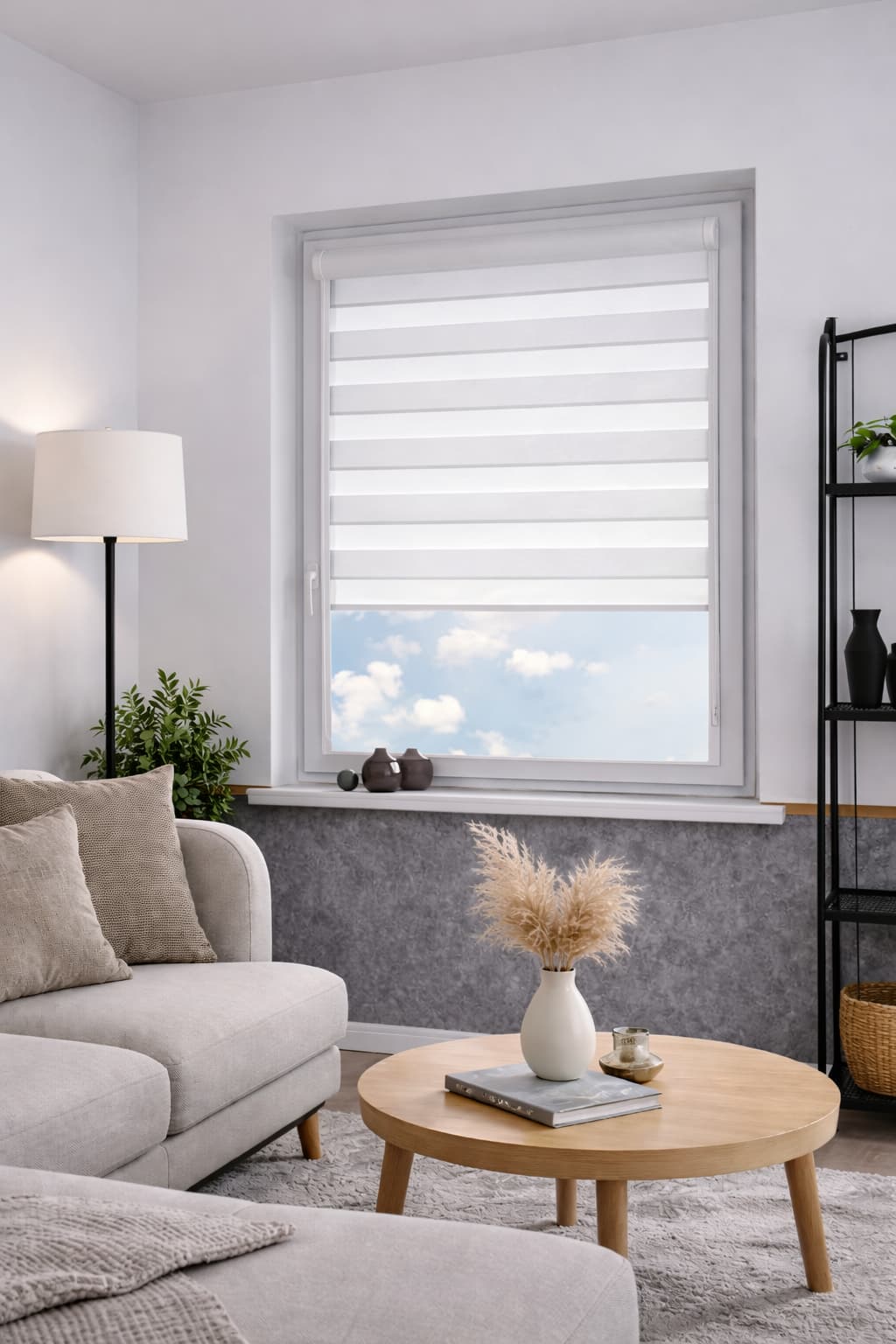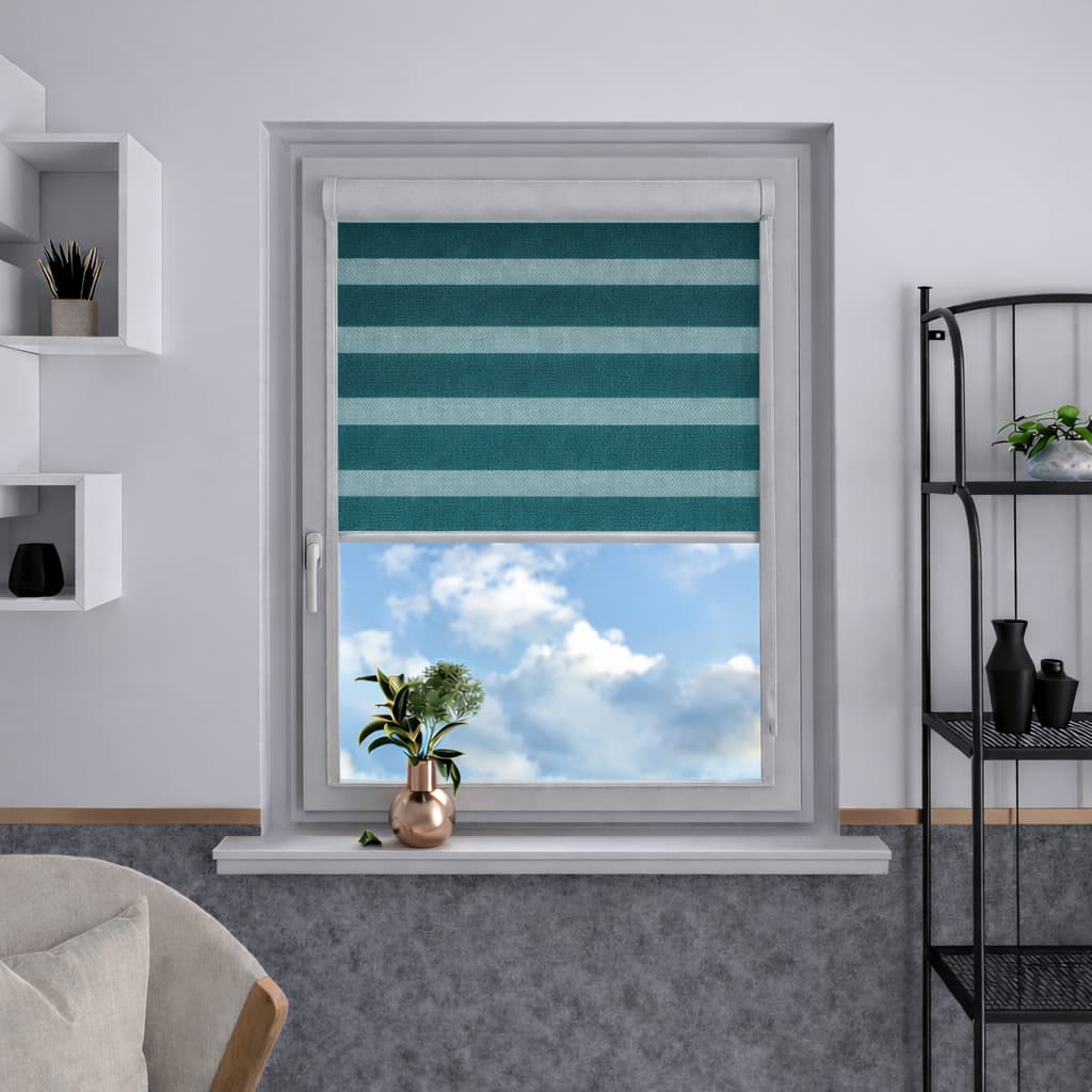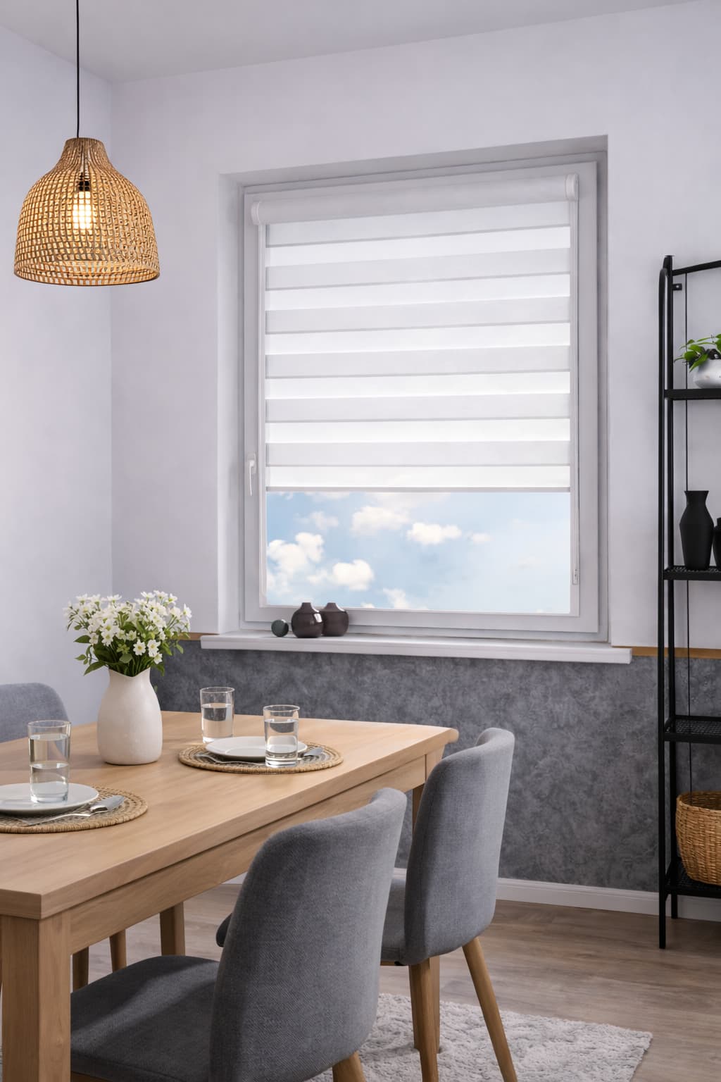 Naprzemienne jasno szare pasy transparentne i zaciemniające umożliwiają swobodną regulację światła, podkreślając elegancki i nowoczesny charakter wnętrza. Jasnoszara tkanina dodaje roletom subtelności i harmonijnie komponuje się z różnorodnymi aranżacjami.