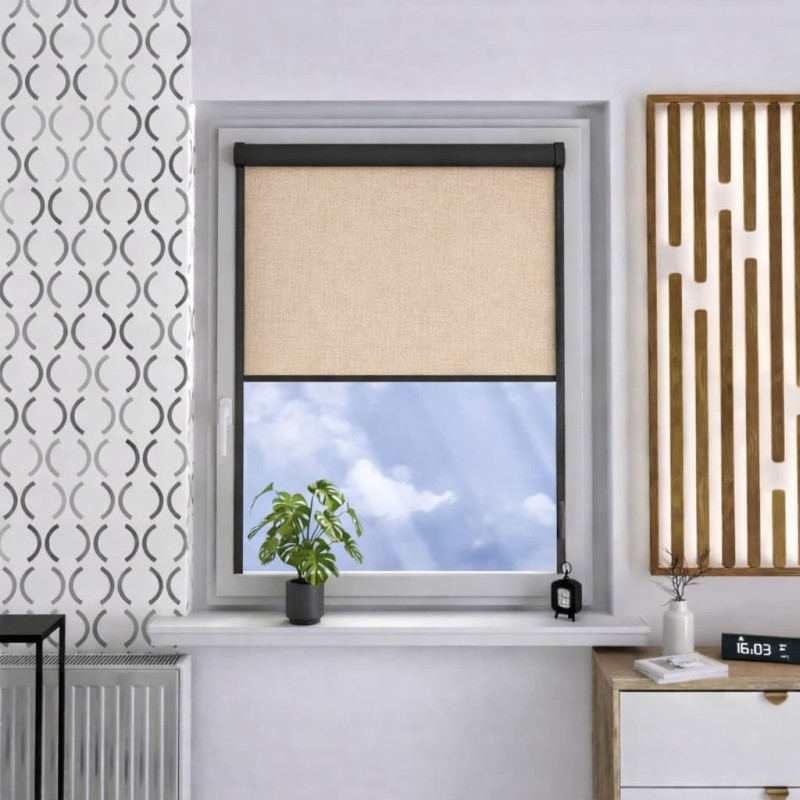✅Ciemnobeżowa tkanina blackout – zapewnia niemal pełne zaciemnienie, idealne dla pomieszczeń wymagających kontroli nad światłem.