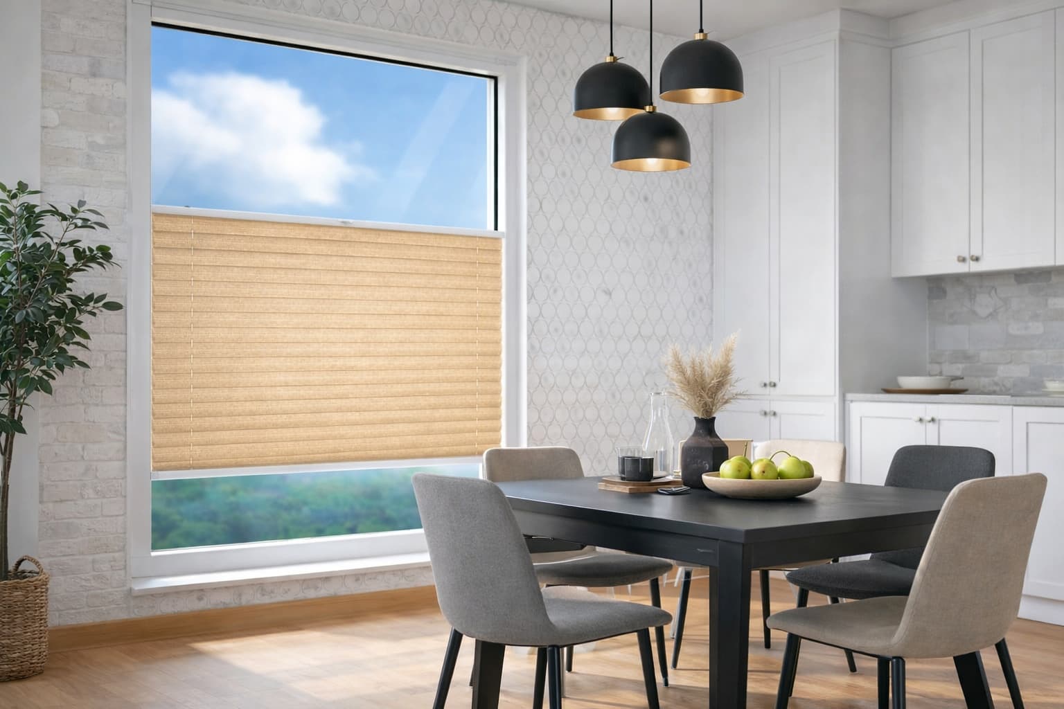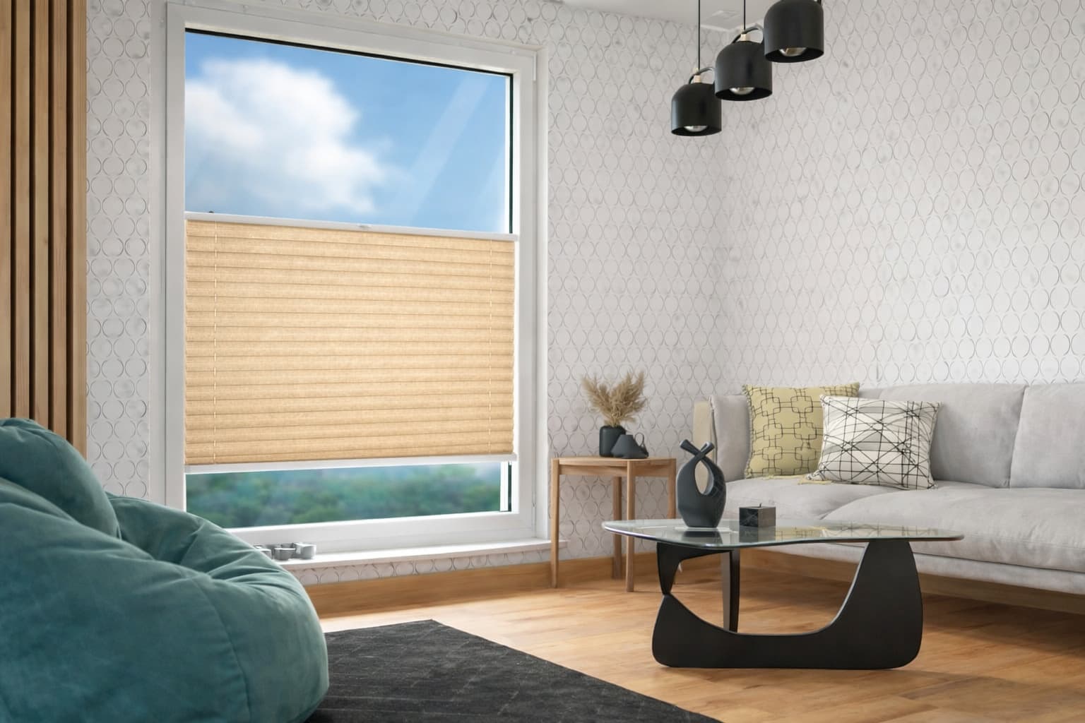Rolety plisowane firankowe w kolorze beżowo-piaskowym o średnim stopniu zaciemnienia skutecznie ograniczają dopływ światła, zapewniając komfortowe przyciemnienie wnętrza. Dzięki strukturze komórkowej poprawiają izolację termiczną, chroniąc przed nagrzewaniem latem i utratą ciepła zimą. Ponadto od zewnętrznej strony roleta wykonana jest z tkaniną w kolorze białym, dzięki czemu skutecznie rozprasza światło, zwiększając tym samym komfort użytkowania.