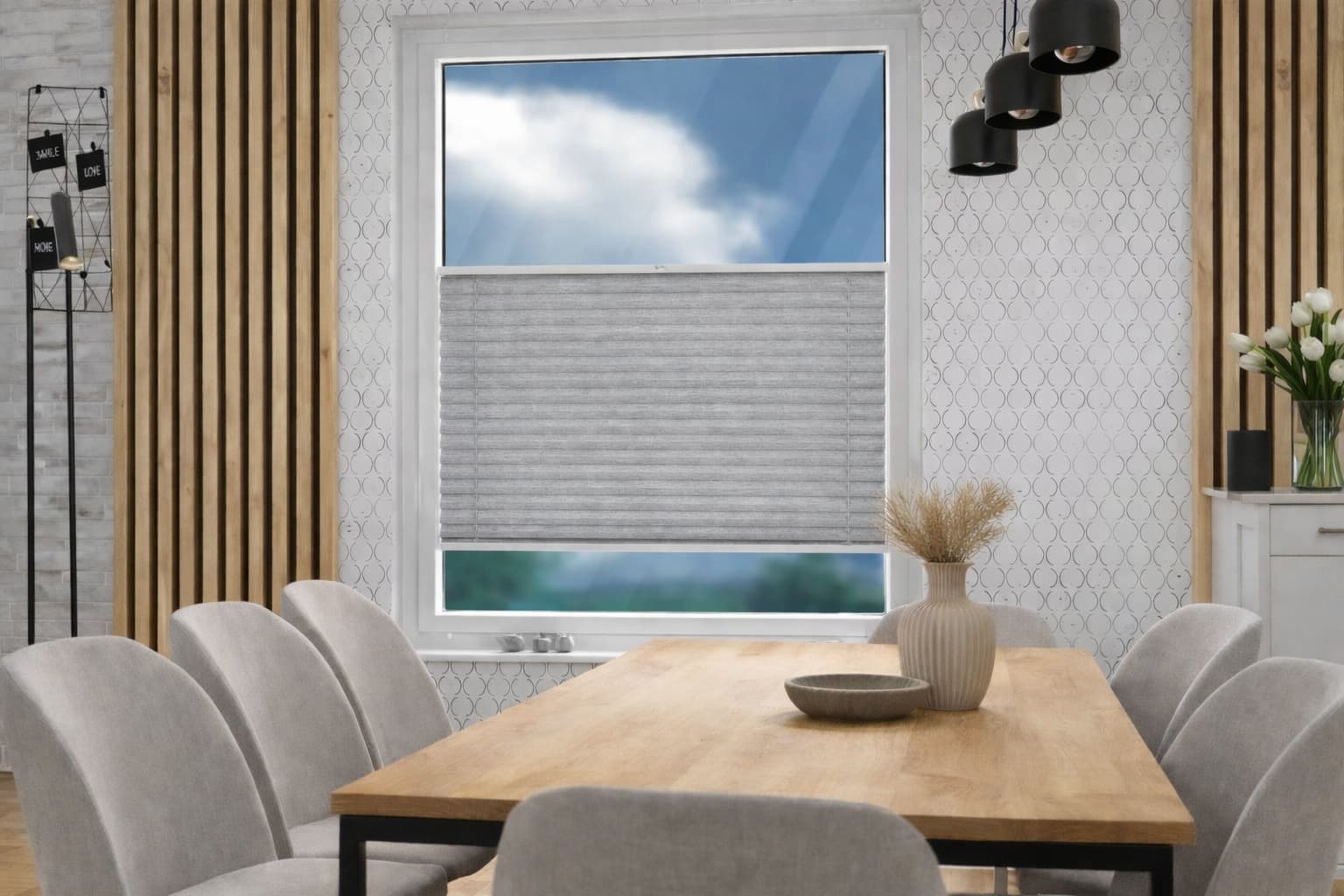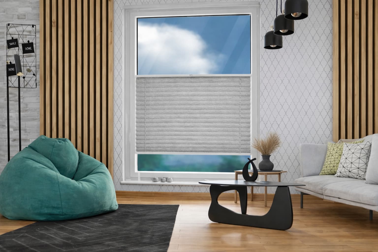 Rolety plisowane zaciemniające w kolorze szarym wykonane są z gęsto tkanych materiałów, dzięki czemu latem chronią pomieszczenie przed nadmiernym nasłonecznieniem, zaś zimą – przed utratą ciepła. Dodatkowo, zapewniają izolację akustyczną, stwarzając idealne warunki miedzy innymi do sypialni.
