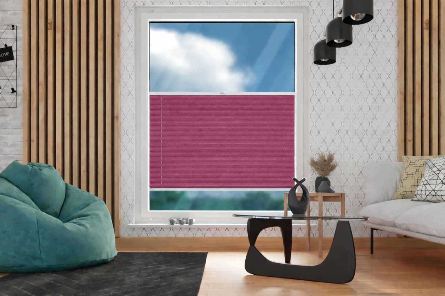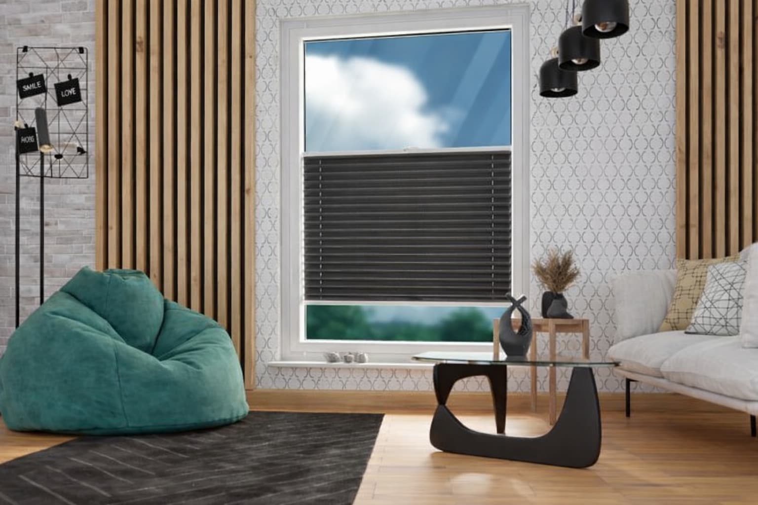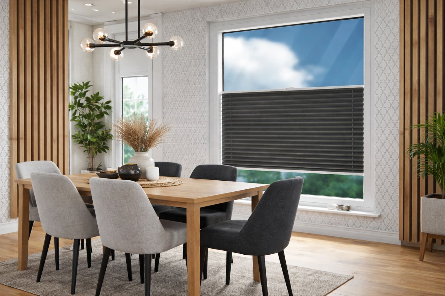 Rolety plisowane zaciemniające w kolorze grafitowym wykonane są z gęsto tkanych materiałów, dzięki czemu latem chronią pomieszczenie przed nadmiernym nasłonecznieniem, zaś zimą – przed utratą ciepła. Dodatkowo, zapewniają izolację akustyczną, stwarzając idealne warunki miedzy innymi do sypialni.