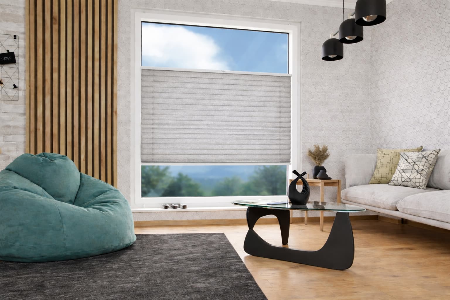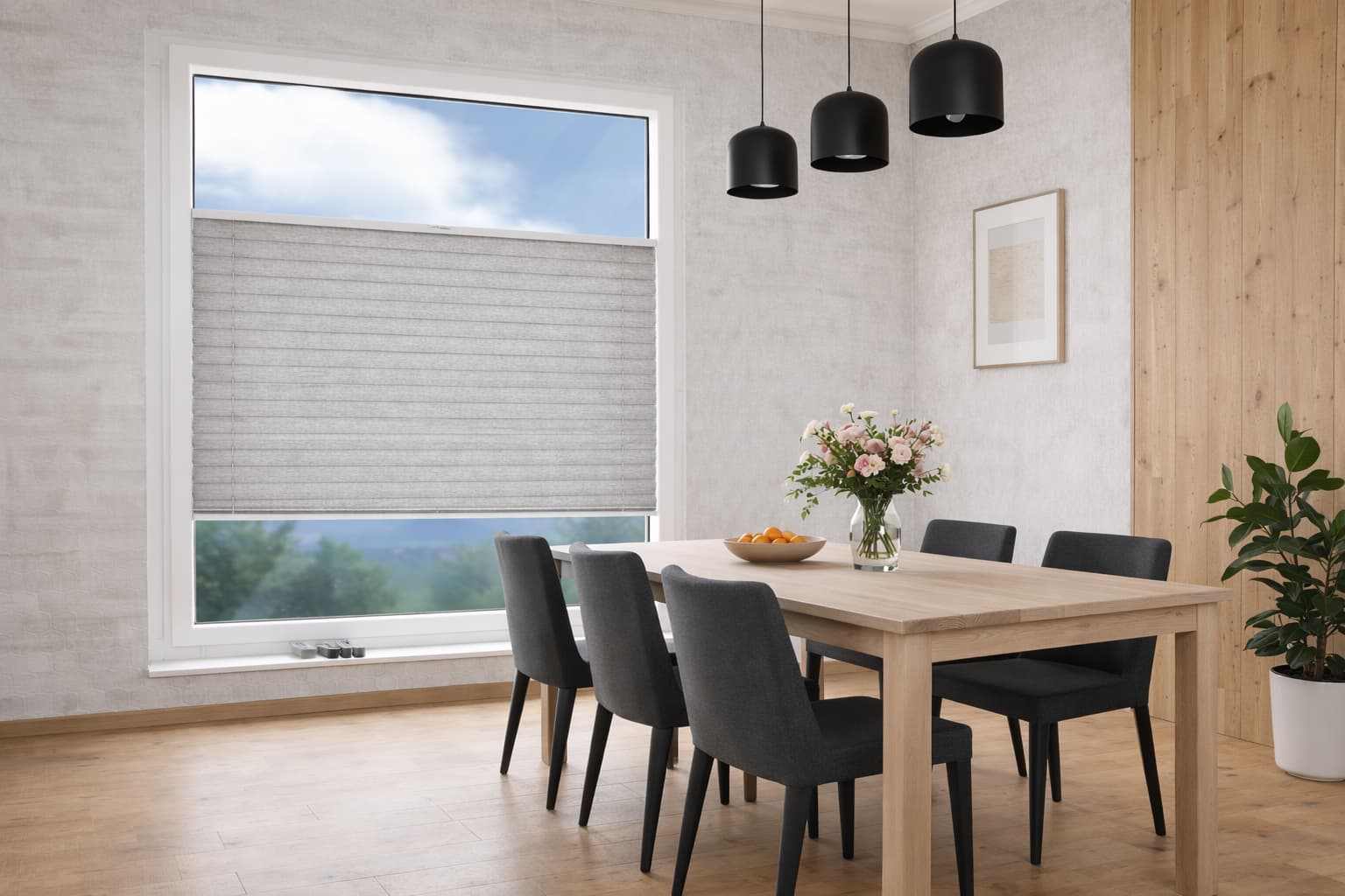 Rolety plisowane wykonane z tkaniny AD400 o strukturze plastra miodu w kolorze szarym zapewniają wysoki poziom zaciemnienia oraz izolację termiczną. Budowa komórkowa ogranicza nagrzewanie wnętrza latem i pomaga utrzymać ciepło zimą. Dodatkowo poprawia komfort akustyczny, co czyni je idealnym rozwiązaniem wszędzie tam, gdzie komfort, cisza i prywatność stawiane są na pierwszym miejscu.