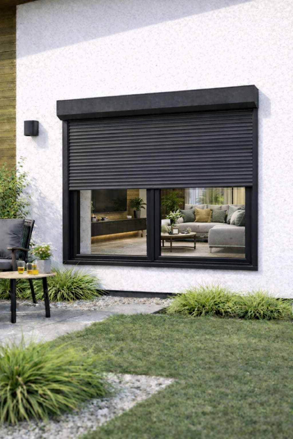 Szaro-antracytowa roleta zewnętrzna adaptacyjna zbudowana jest z lameli wypełnionych pianką poliuretanową. Dzięki temu latem zapewnia ochronę przed nadmiernym nasłonecznieniem, zaś zimą – przed utratą ciepła.