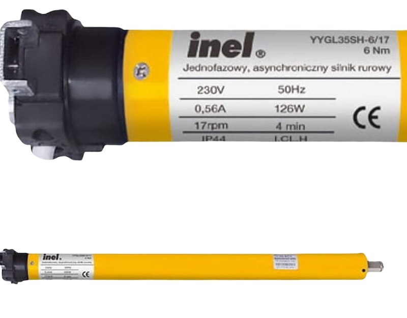 Siłownik INEL z serii N-6SH z wykorzystaniem mechanicznego wyłącznika krańcowego. Model INEL N6SH to silnik rurowy o sile 6 Nm, pracujący przy napięciu 230 V (YYGL35SH-6/17), przystosowany do rur oktagonalnych o średnicy 40 mm. Moment obrotowy tego silnika wynosi 6 Nm przy prędkości 17 obrotów na minutę. W komplecie znajdują się niezbędne akcesoria. Jest to jednofazowy, asynchroniczny silnik rurowy.