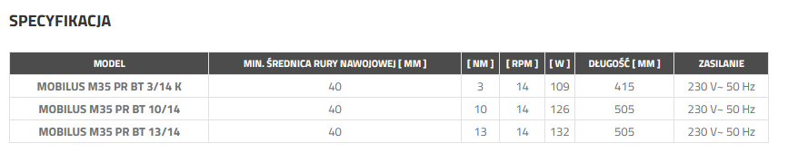 Silniki z serii MOBILUS M35/PR 13/14 przeznaczone do rur nawojowych o średnicy 40 mm, generujące 13 Nm momentu obrotowego przy prędkości 14 obr/min. To wysokogatunkowe, wysokiej jakości silniki.