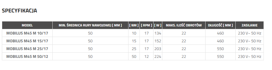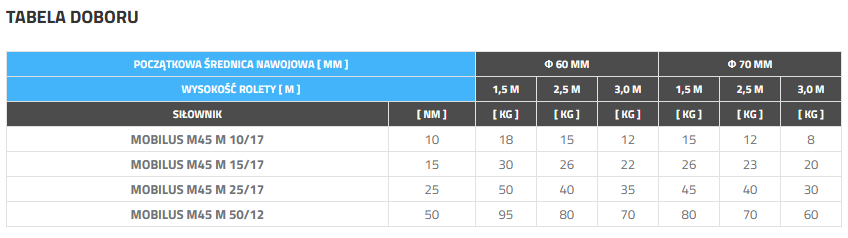 Seria silników MOBILUS M45 M 50/12 obr została zaprojektowana do rur nawojowych o średnicy Ø 60 mm. Posiadają one imponującą moc 50NM i prędkość obrotową 12 obr/min. Silniki są wyposażone w mechaniczne krańcówki, które można regulować ręcznie.