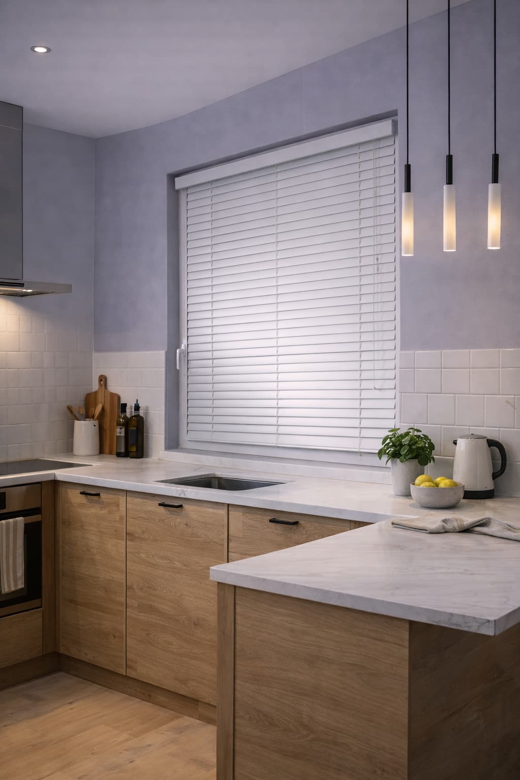 W białych żaluzjach aluminiowych 25 mm stosowany jest sznurek, który umożliwia ustawienie żaluzji pod skosem. Umieszczone w niewielkich odstępach od siebie, zapewniają pełną kontrolę oświetlenia.