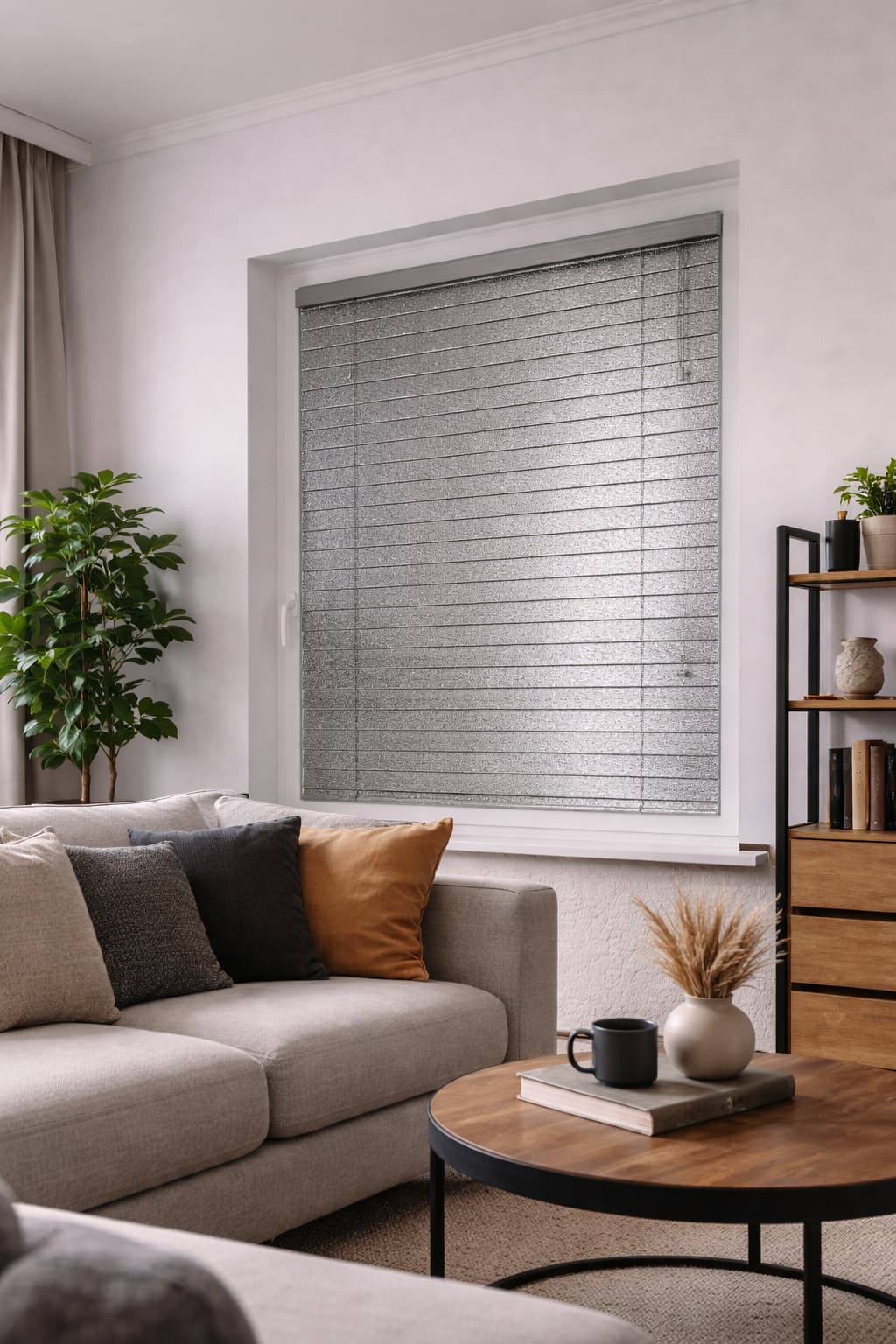 ✅Szorstka, matowa struktura lameli – subtelna faktura typu velvet w srebrnym brokatowym odcieniu nadaje żaluzjom nowoczesny, elegancki charakter oraz delikatnie rozprasza światło, ograniczając refleksy.